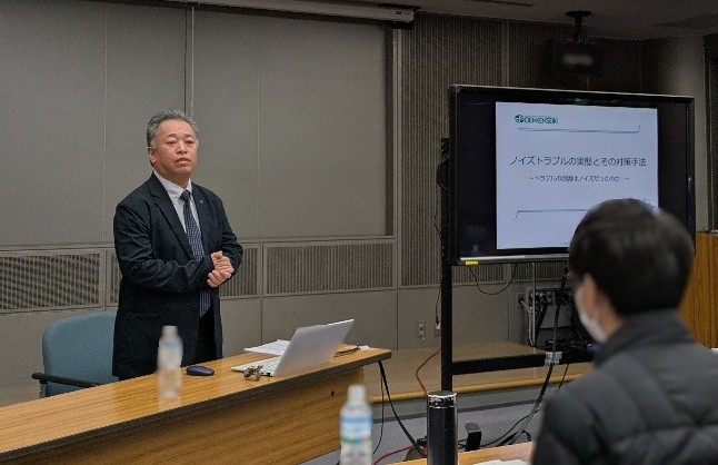 本研修では、電気電子機器に不可欠なノイズ対策について、基礎から実践まで体系的に学ぶことを目的としました。講師には、基礎解説として電研精機研究所 ノイズトラブル相談室 室長 大阿久 学 氏、またノイズ対策部品の活用と実践編として北川工業株式会社 EMCセンター センター長 梶田 幸央 氏をお招きしました。