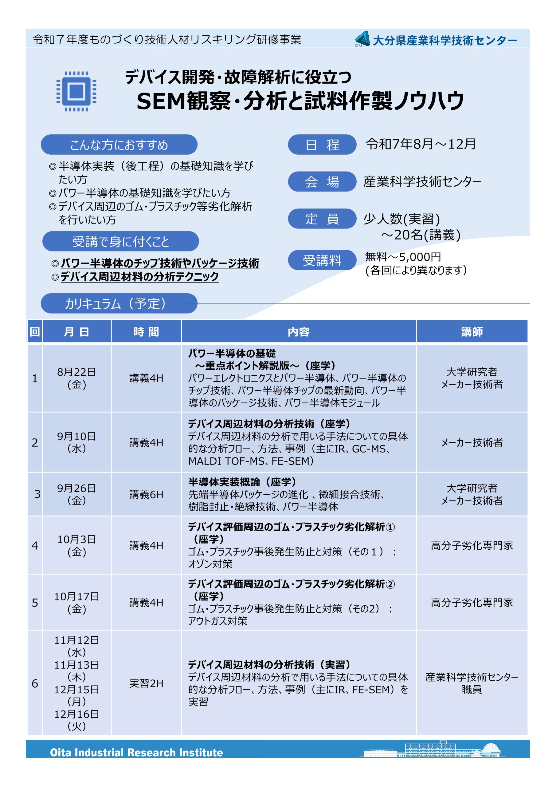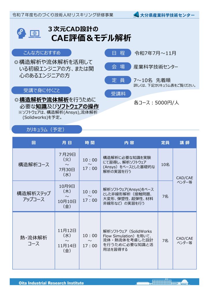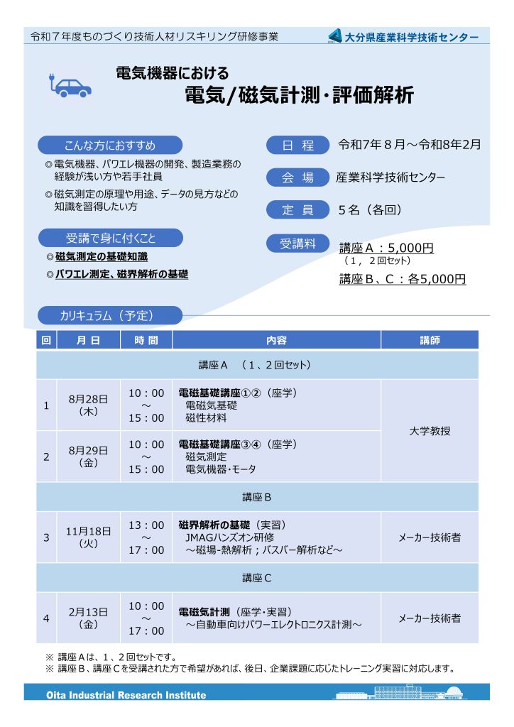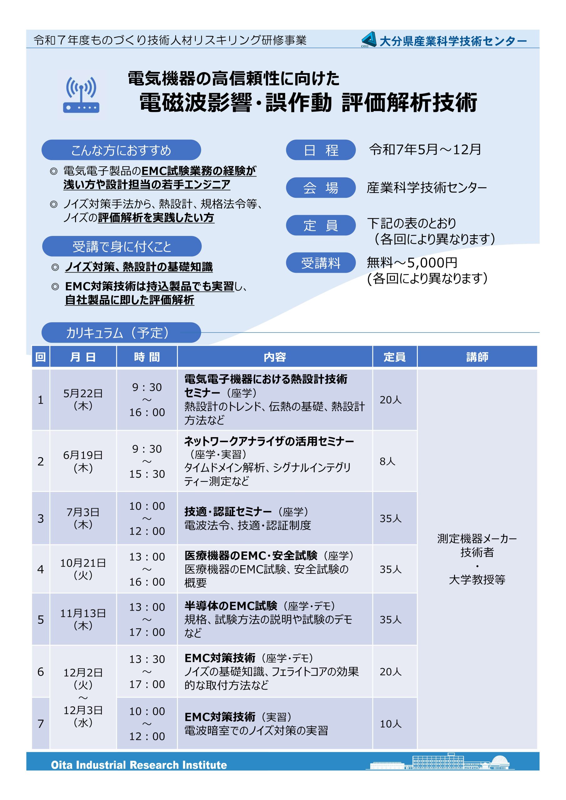 令和5,6年度に引き続き、県内ものづくり企業の技術力強化に役立つよう設計や評価解析など高度な技術人材を育成するリスキリング研修を実施します。外部の専門家の基礎講座に加えて、産業科学技術センター内の評価解析・測定機器等を活用した実技・実習により、専門スキルの習得が可能です。 自社エンジニアのさらなるスキルアップに繋がる5つの研修プログラムを用意しました。ぜひご参加をお待ちしております。